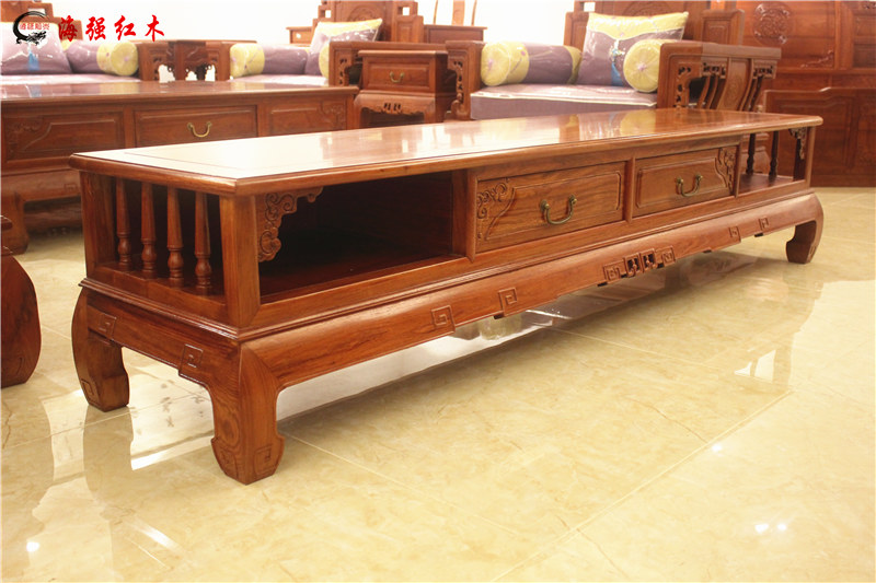 名稱:海強1號電視柜材質:非洲花梨木/緬甸花梨木尺寸:212*48*44cm側面海強一號電視柜帶有兩個抽屜。和海強一號紅木沙發(fā)配套的效果。